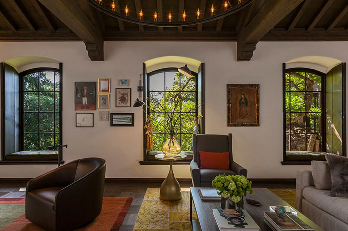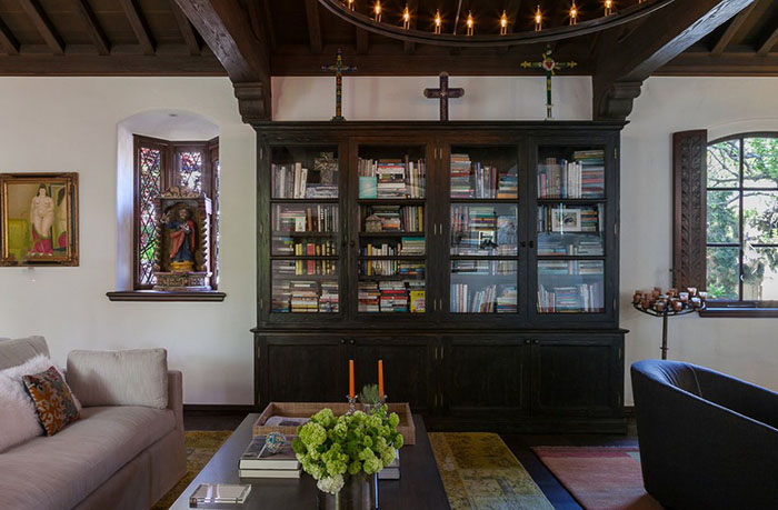 Кроме музыкального центра, еще одним ключевым элементом является выполненный на заказ книжный шкаф. За стеклом находится библиотека с книгами клиентки, свидетельствами семейной истории. Кроме этого, гостиная декорирована предметами мексиканского искусства.